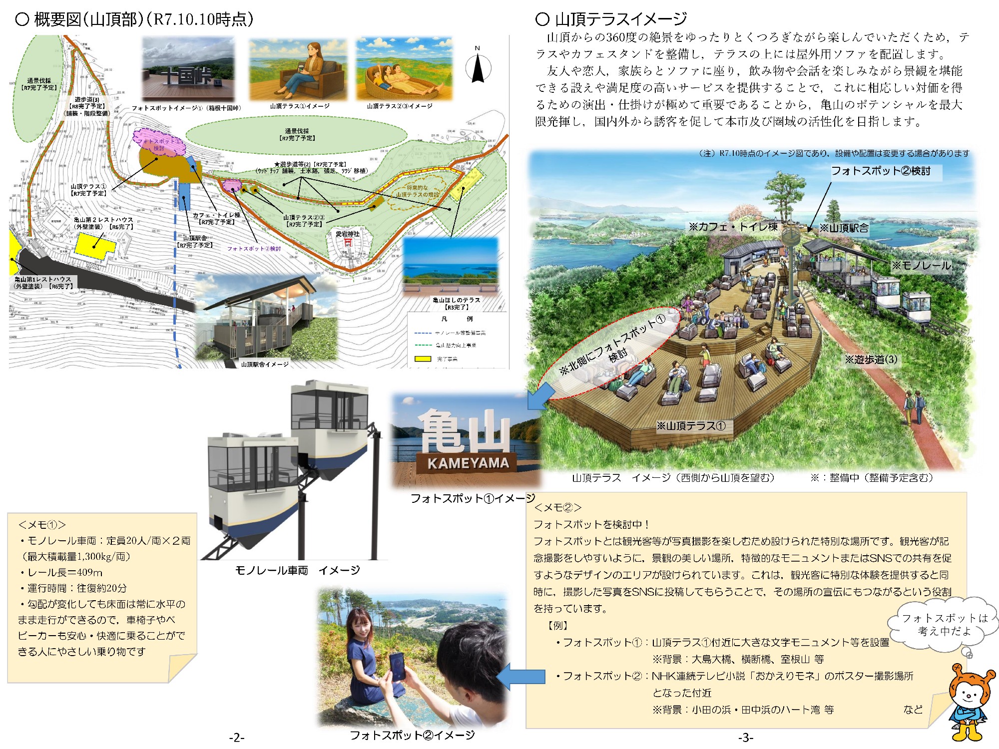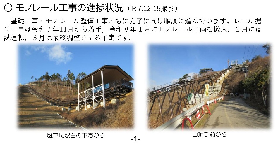 なお、構想段階では、山頂にブランクを設置したり、周辺に山遊びやアスレチックのゾーンを民間の力で整備してもらうことも考えており、今後の展開も期待されます。麓からのモノレール運行についても、経営が順調にいけば将来的な可能性が残されています。