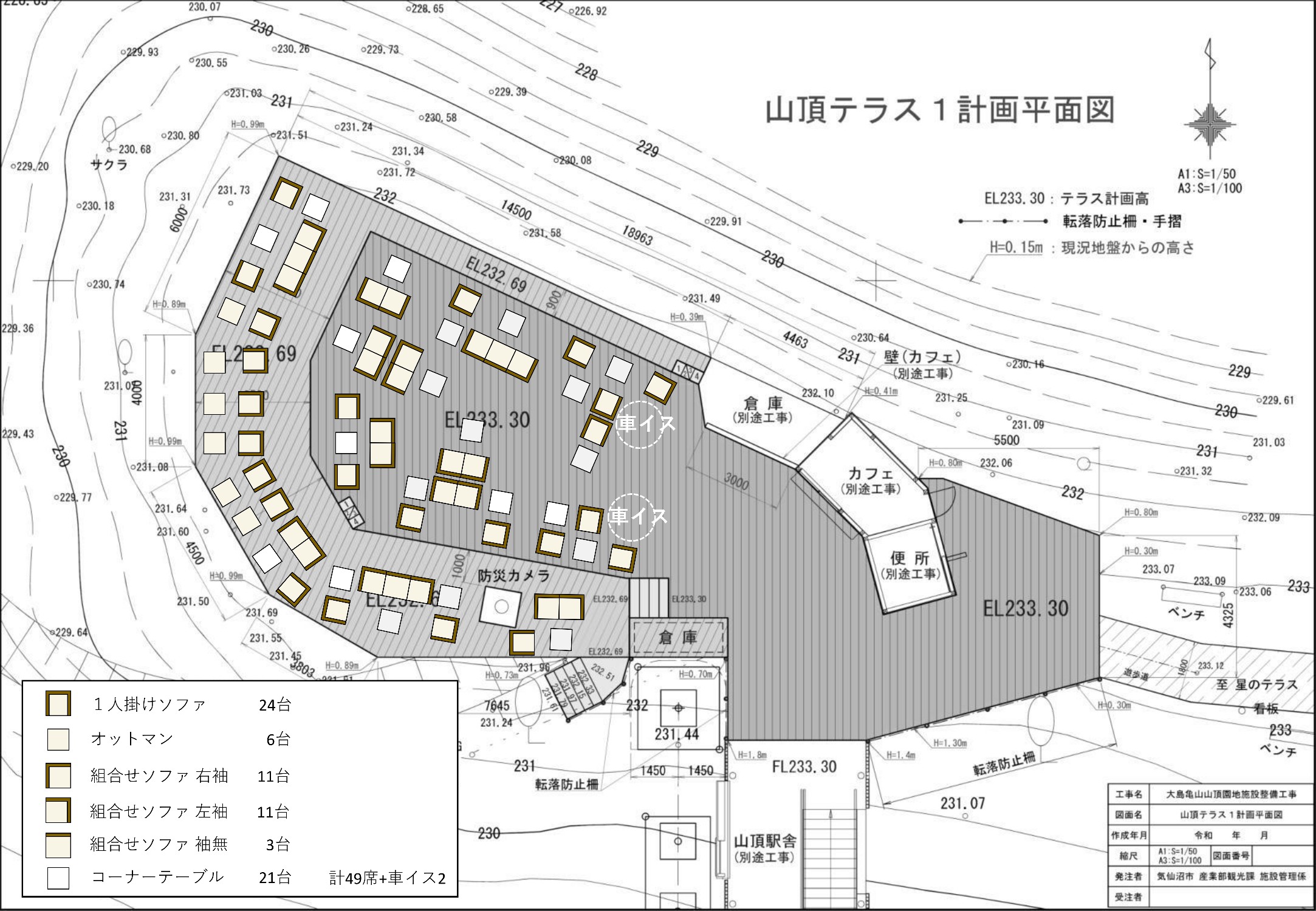 山頂に木造平屋建て(20.97㎡)のカフェスタンドとトイレ(小1・大1)を新設します。また、既設の亀山ほしのテラスに加え、景色を楽しめる3つのテラスを整備します。テラスには屋外用のソファ34席分とテーブルを設置し、ゆっくり滞在できる空間にします。