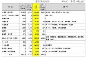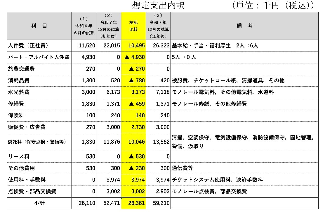 支出は5247万円(初年度)~5921万円(15年後)に見直されました。主な理由として、①2人だった正社員を6人に増加に施設の清掃や園地の草刈りなどの委託費の追加③チケットシステム経費やモノレール点検の費用追加などです。