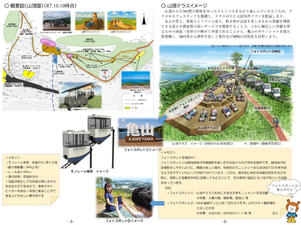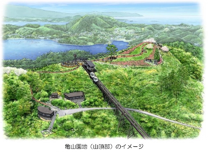 津波と火災で全壊した亀山リフトの復旧が叶わず、「リフトの代替手段」としてモノレール整備が計画されましたが、「山頂の魅力化とアクセス手段の整備けに方針を転換しました。山梨の清里テラスや長野の白馬岩岳の視察などにより、「モノレールは移動手段に過ぎず、旅の目的は山頂における景観と心地よい滞在空間である」と確認したためです。