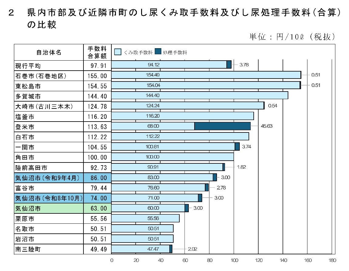 ・1世帯当たりの年間平均負担額は現行1万8462円で、令和9年度には2万5201円と試算した。県内市部と近隣市町と比較すると引き上げ後でも低めの水準となる。10㍑当たりの負担額は気仙沼市が改正後に86円、石巻市は155円
